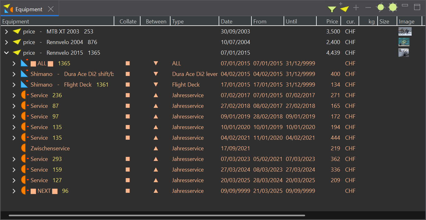Equipment An equipment can collate tours by its own or it can contain equipment parts and/or services which can collate tours, but both is not possible. It can be created in the view toolbar or context menu. |